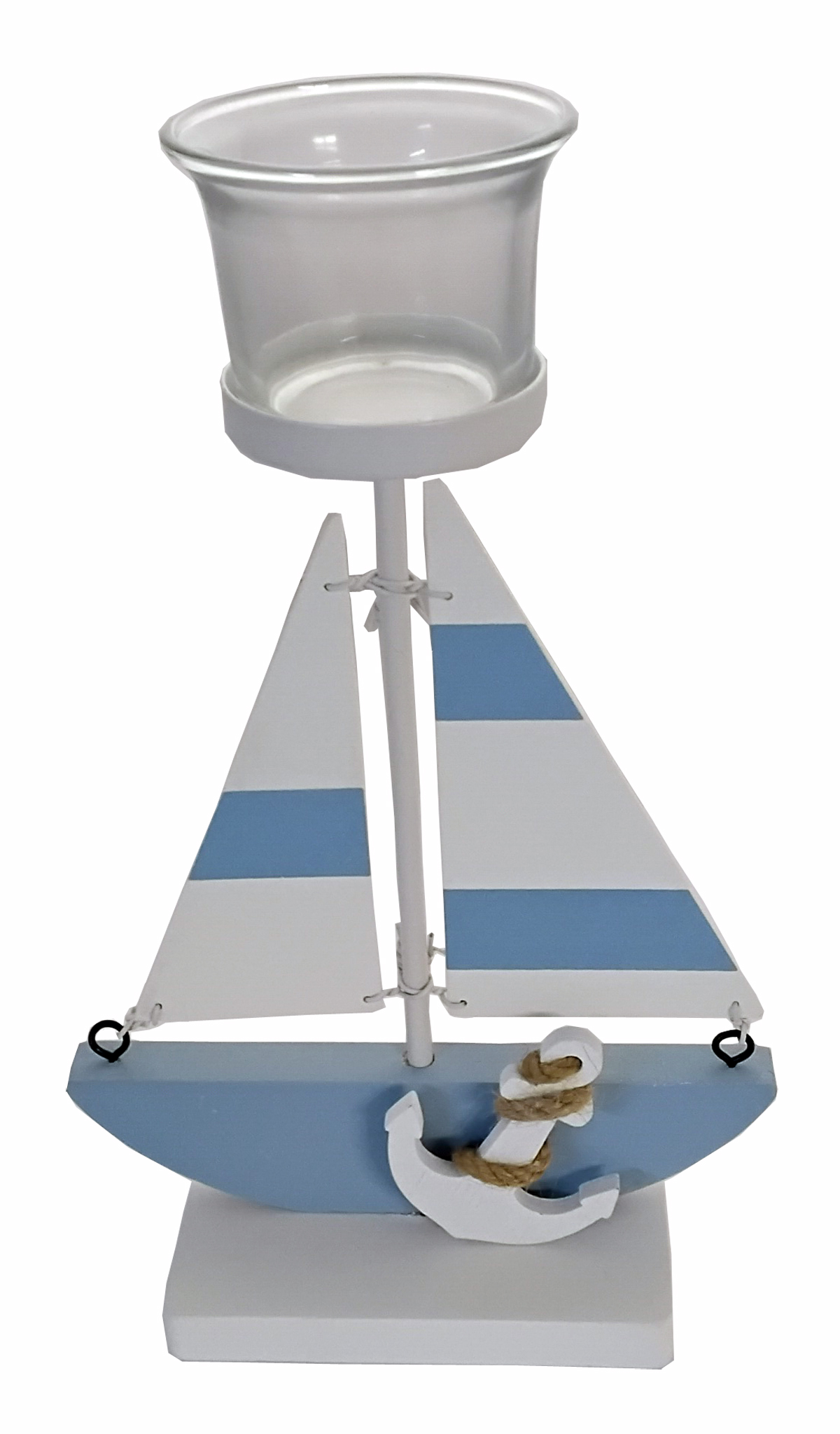 - Segelboot in weiß-blau mit Glaseinsatz für Teelicht